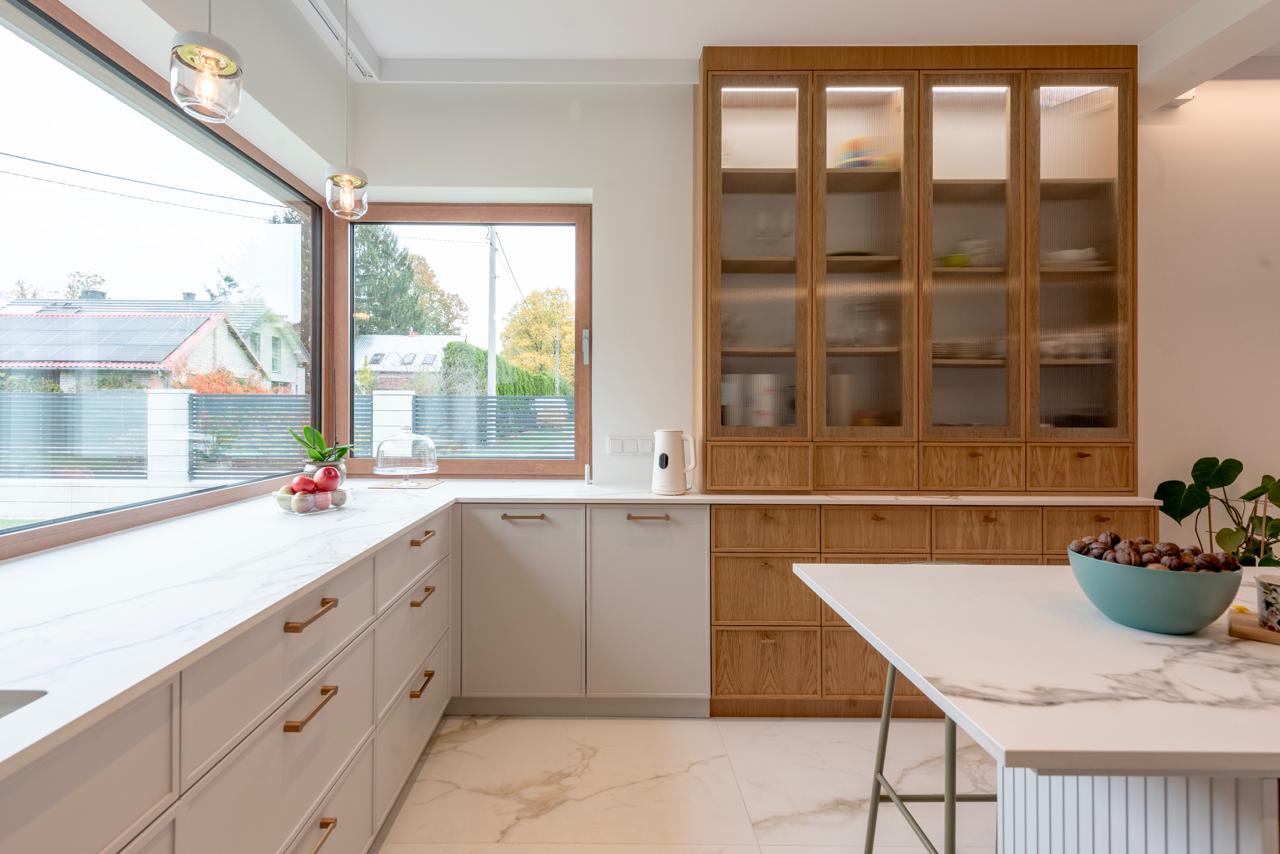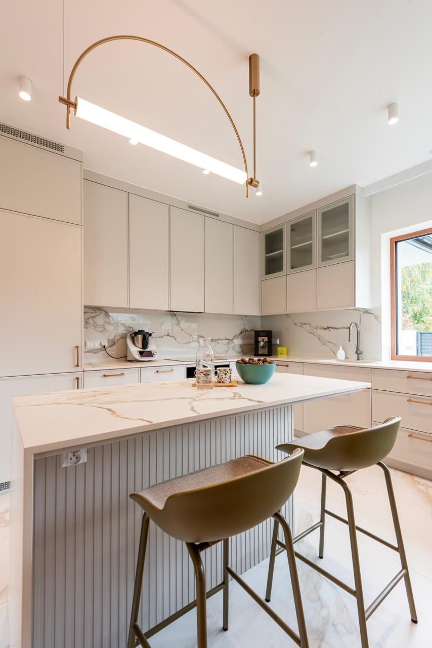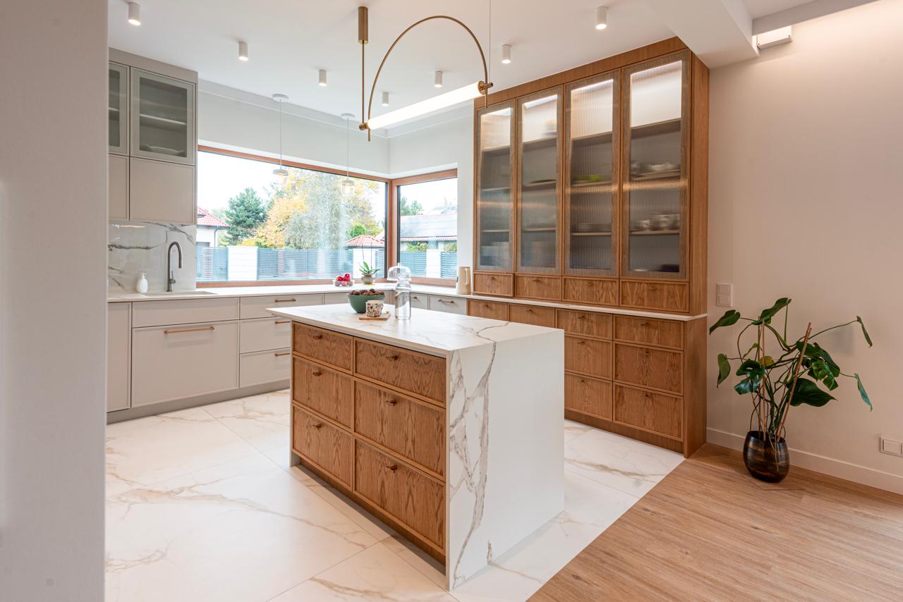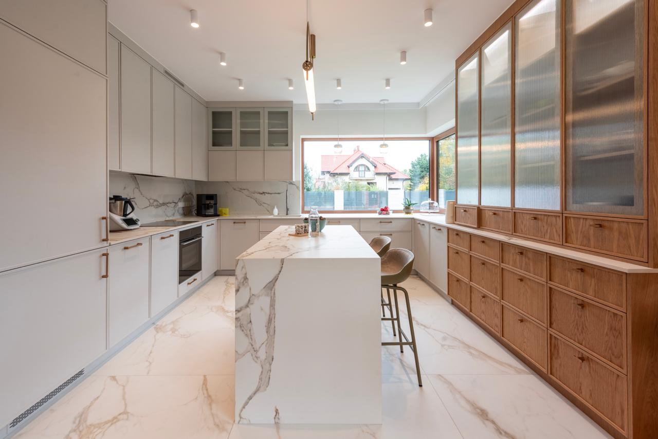Ta przestronna kuchnia to esencja nowoczesnego stylu, w którym funkcjonalność spotyka się z finezyjnym detalem. Projekt opiera się na efektownym kontraście: minimalistyczna, jasna zabudowa z eleganckimi złotymi uchwytami sąsiaduje tu z ciepłym, naturalnym dębem. Uwagę przyciąga wyspa kuchenna o unikalnej, ryflowanej podstawie oraz imponująca witryna z ornamentowego szkła, która dodaje wnętrzu lekkości i sznytu retro. Całość wieńczą blaty o wyrazistym rysunku marmuru, tworząc przestrzeń, która jest jednocześnie luksusowa i domowa.