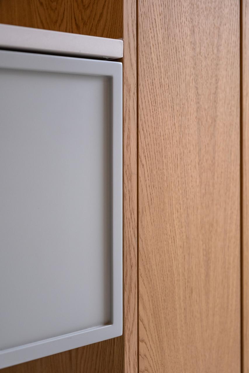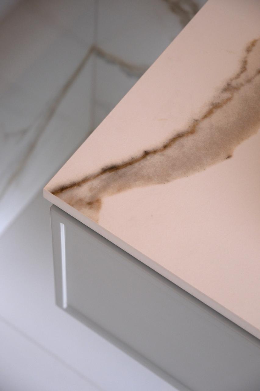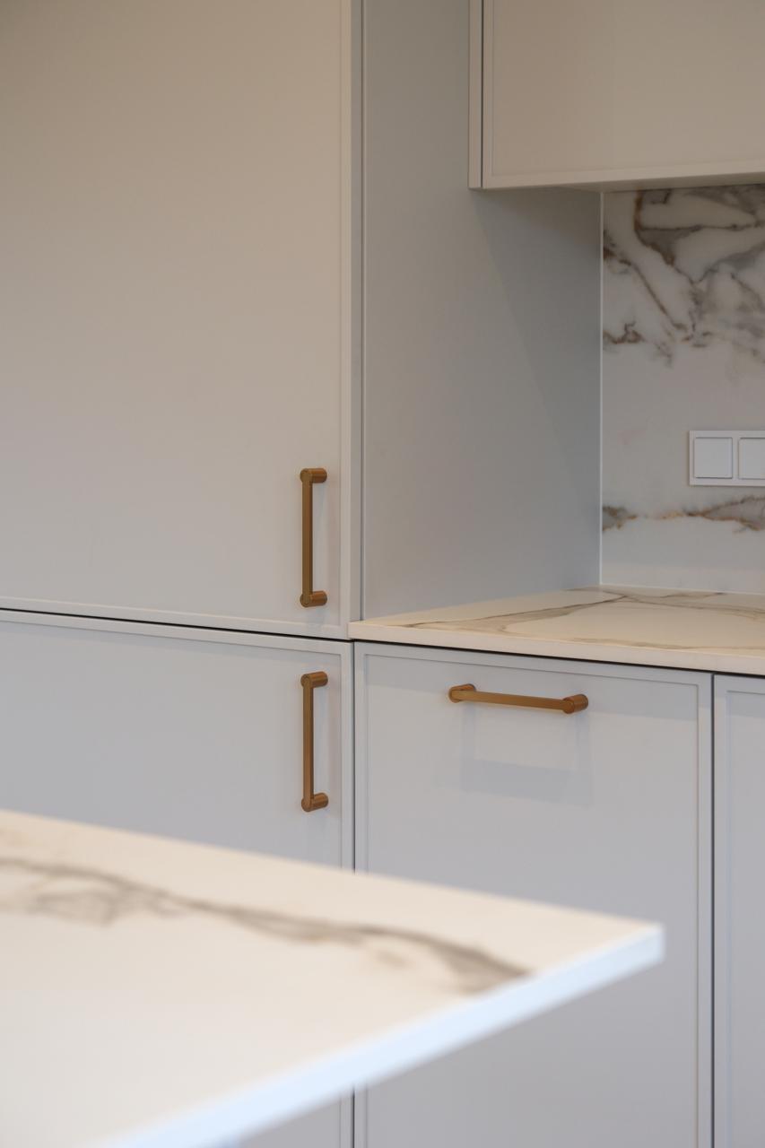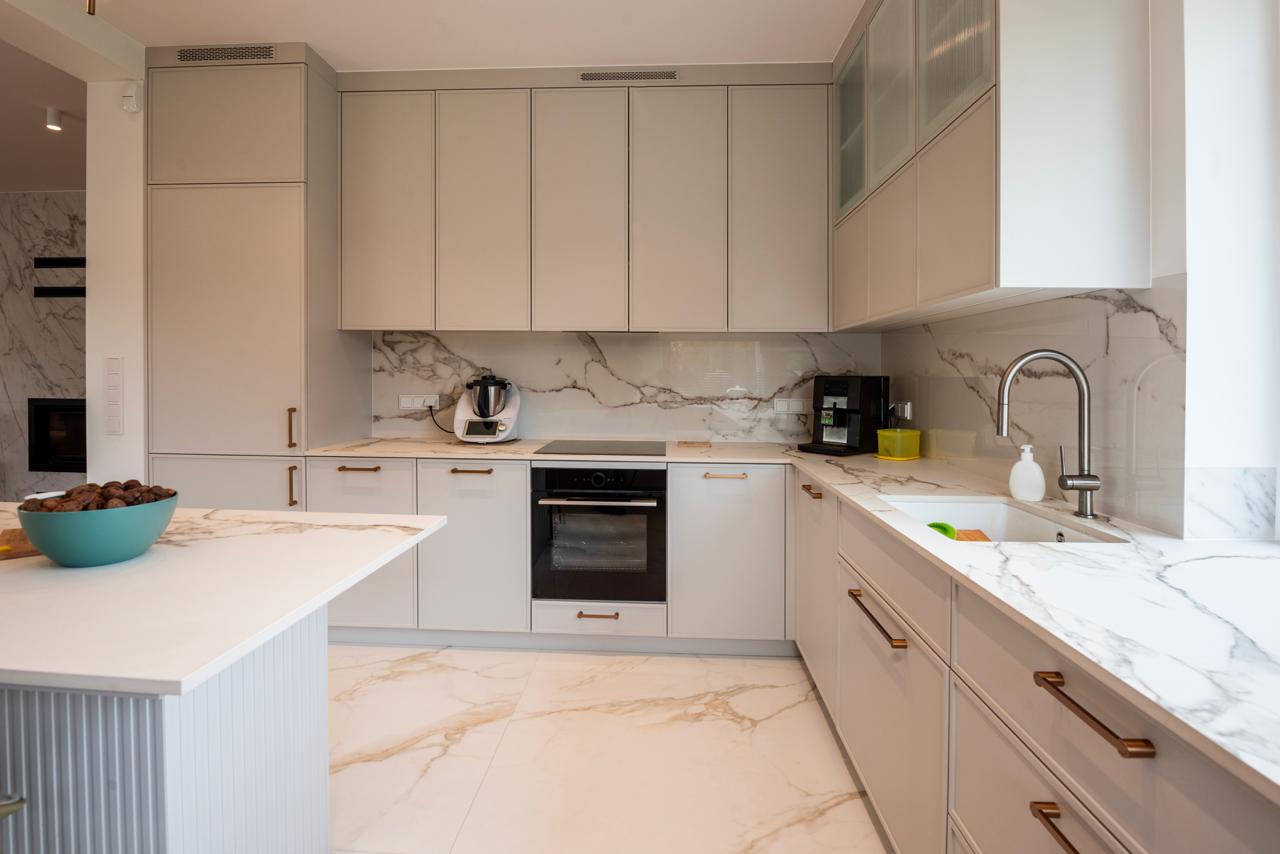 Ta przestronna kuchnia to esencja nowoczesnego stylu, w którym funkcjonalność spotyka się z finezyjnym detalem. Projekt opiera się na efektownym kontraście: minimalistyczna, jasna zabudowa z eleganckimi złotymi uchwytami sąsiaduje tu z ciepłym, naturalnym dębem. Uwagę przyciąga wyspa kuchenna o unikalnej, ryflowanej podstawie oraz imponująca witryna z ornamentowego szkła, która dodaje wnętrzu lekkości i sznytu retro. Całość wieńczą blaty o wyrazistym rysunku marmuru, tworząc przestrzeń, która jest jednocześnie luksusowa i domowa.