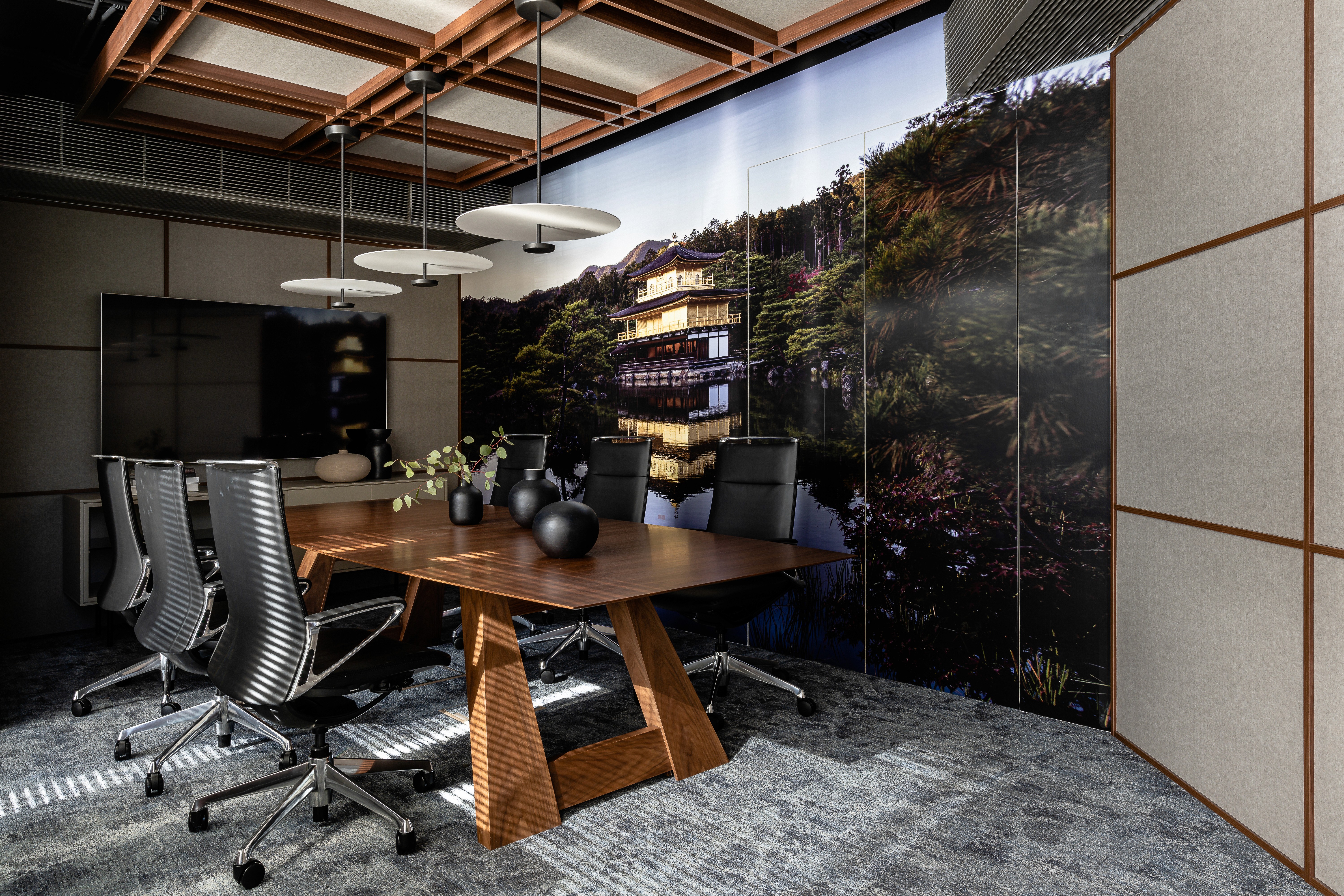 Połączenie drewna z miękkimi panelami akustycznymi osadzonymi w strukturze kratownicy nie tylko daje efekt wizualny, ale także wnosi wartość funkcjonalną. Rytm linii i materiałowa tekstura tworzą tło dla oświetlenia, które rozkłada się równomiernie nad stołem, sprzyjając skupieniu i dialogowi.