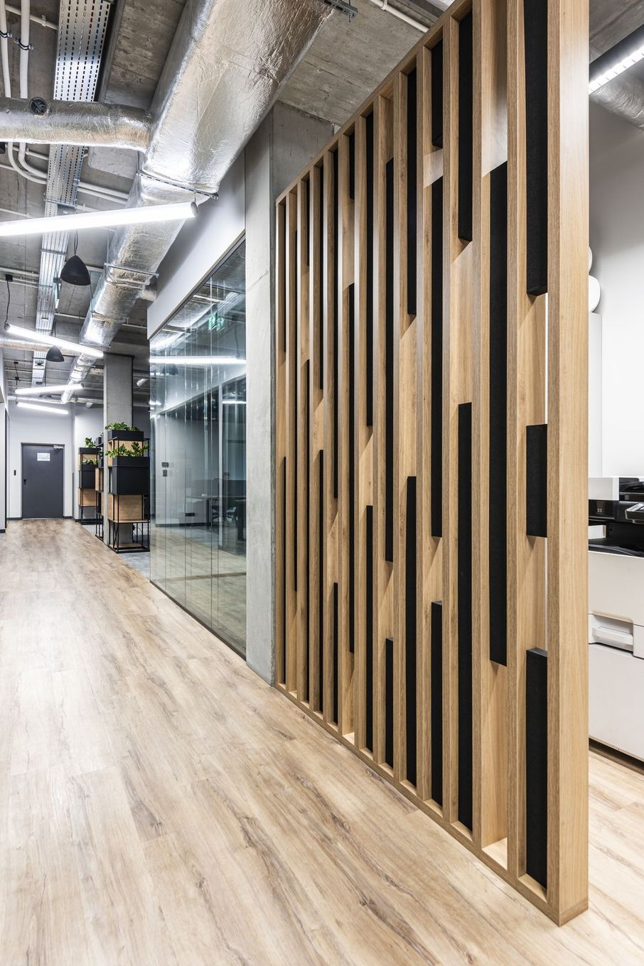 Pionowe lamele o dynamicznym układzie tworzą efektowną strukturę, która wprowadza do wnętrza ciepło i naturalny charakter drewna. Dzięki precyzyjnemu wykonaniu, przepierzenie łączy estetykę z praktycznością, pozwalając na wizualne oddzielenie stref bez zamykania przestrzeni i blokowania przepływu światła.